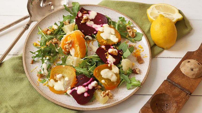 Roasted Beet, Citrus Salad with Walnuts and Zested Vodka Creme Fresh