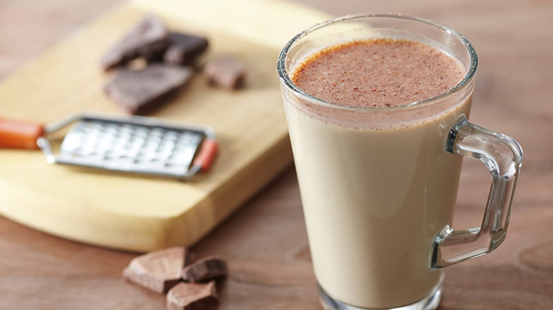 Combine Ancho Reyes and homemade hot chocolate in a footed glass. Garnish with grated cinnamon.