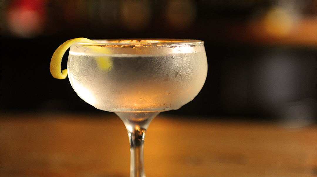 Stir with ice in a mixing glass. Strain into a chilled coupe glass. Garnish with olives on a cocktail pick.