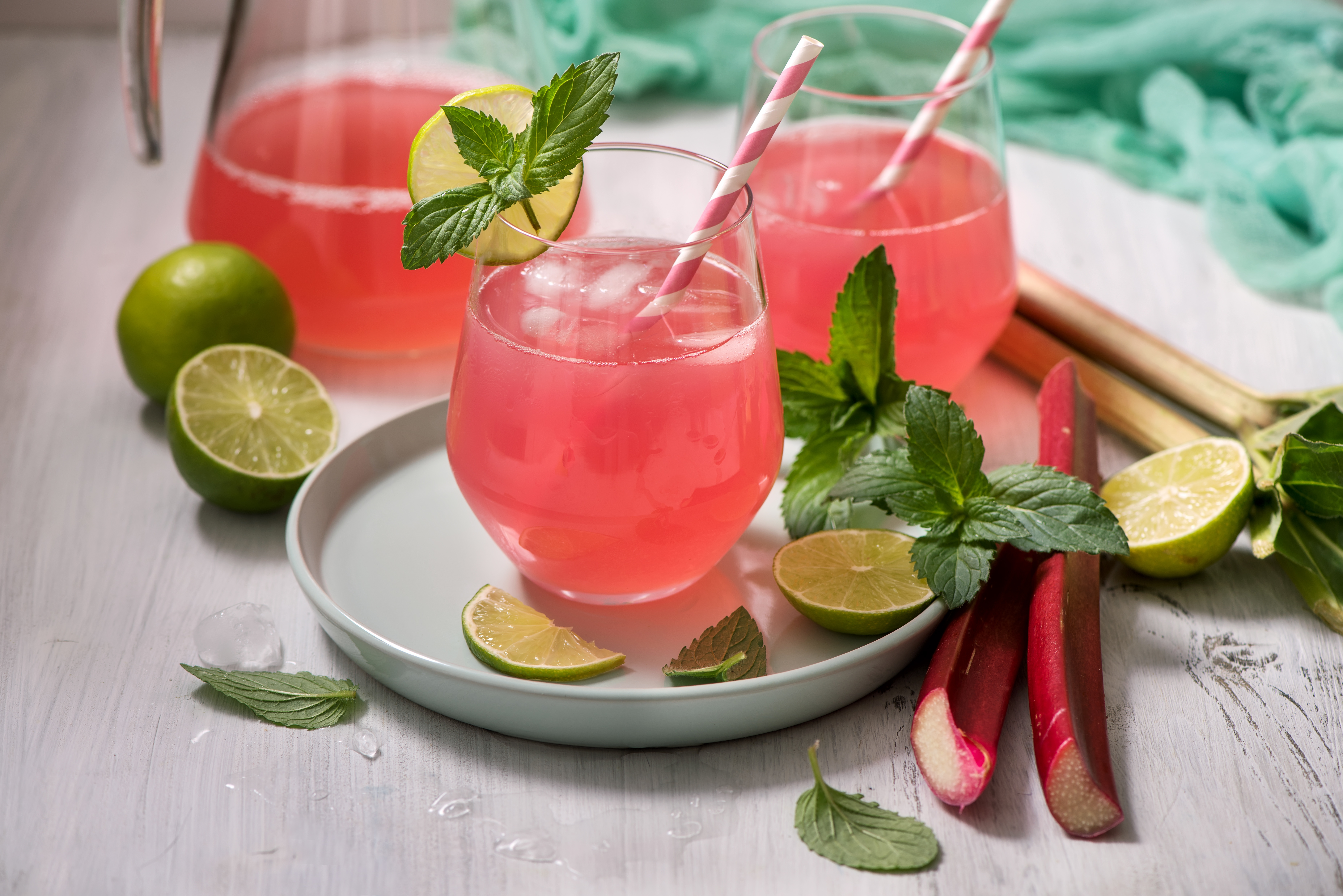 To make the cocktail, combine chilled rhubarb syrup, strawberries, lime juice and gin in a glass with crushed ice and stir. Top with sparkling water and garnish with sliced lime wheels, strawberries and thinly shaved rhubarb for garnish if you're feeling fancy.