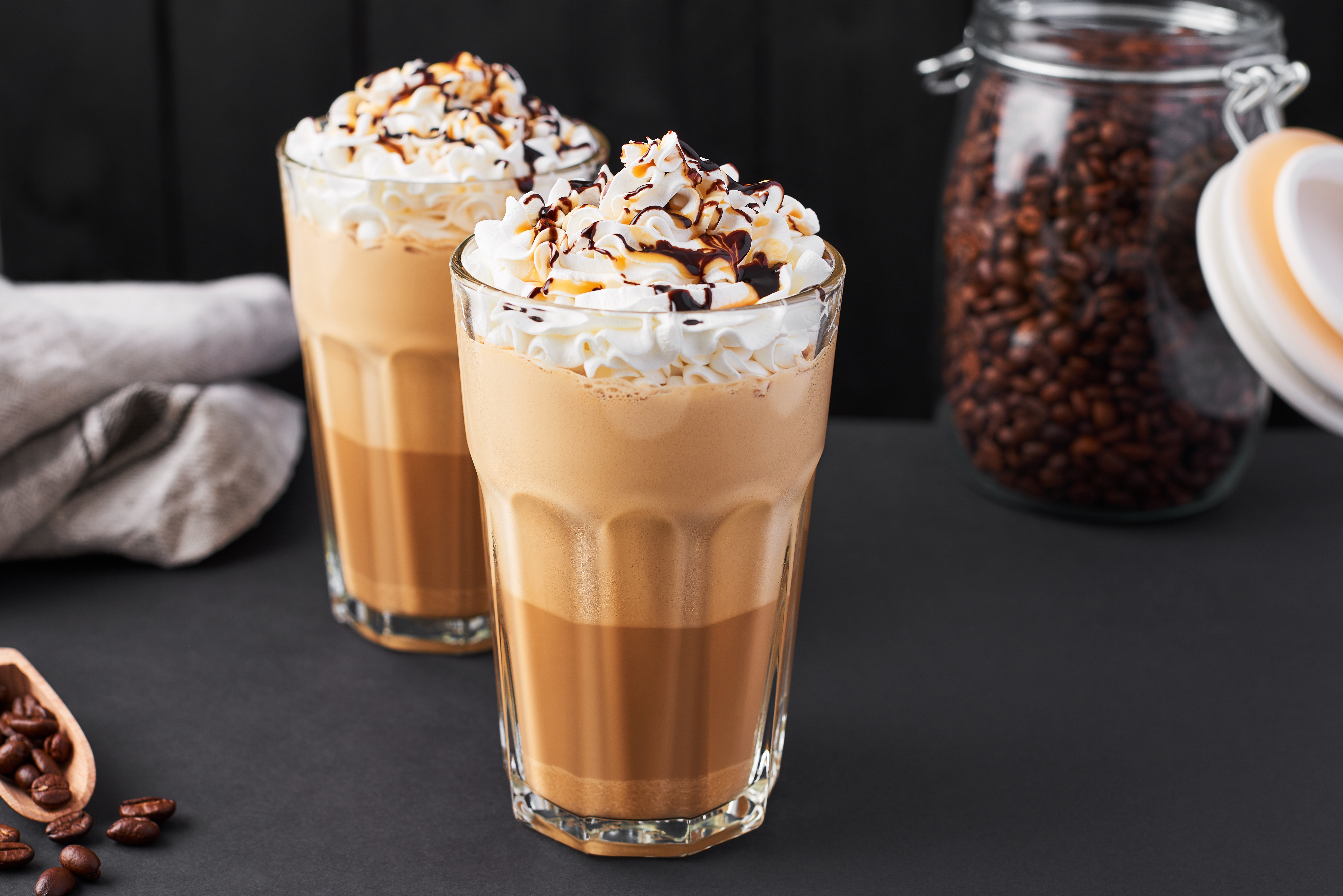 Pour coffee and bourbon in a tall glass with ice. Top with whipped cream and a swirl of chocolate and caramel syrup to taste.