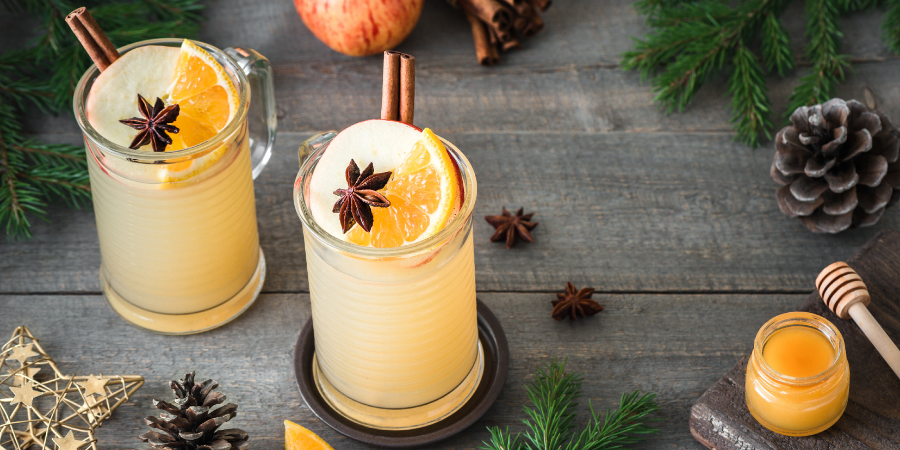 Heat orange juice, bourbon, and ginger with 4 oz of boiling water in a pan. Pour into mug and Garnish with Cinnamon Stick, Star Anise, Orange and Apple Slice. Cheers!